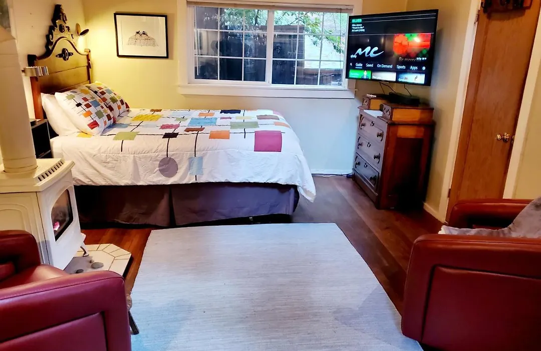 In der Guerneville Cottage! Redwoods! Hot Tub! Fire Table! Fast Wifi!! Serenity Defined! stehen Gästen ein Patio und eine Sitzecke sowie Unterhaltungsmöglichkeiten wie WLAN und ein Flachbildfernseher mit Satellitenkanälen zur Verfügung. Das Badezimmer ist mit einer getrennten Toilette und einer Dusche ausgestattet und verfügt auch über einen Haartrockner und Handtücher.